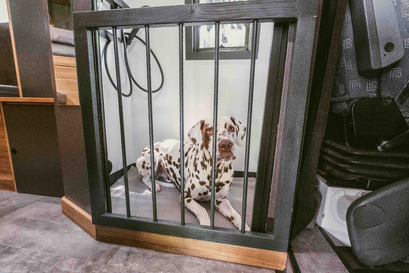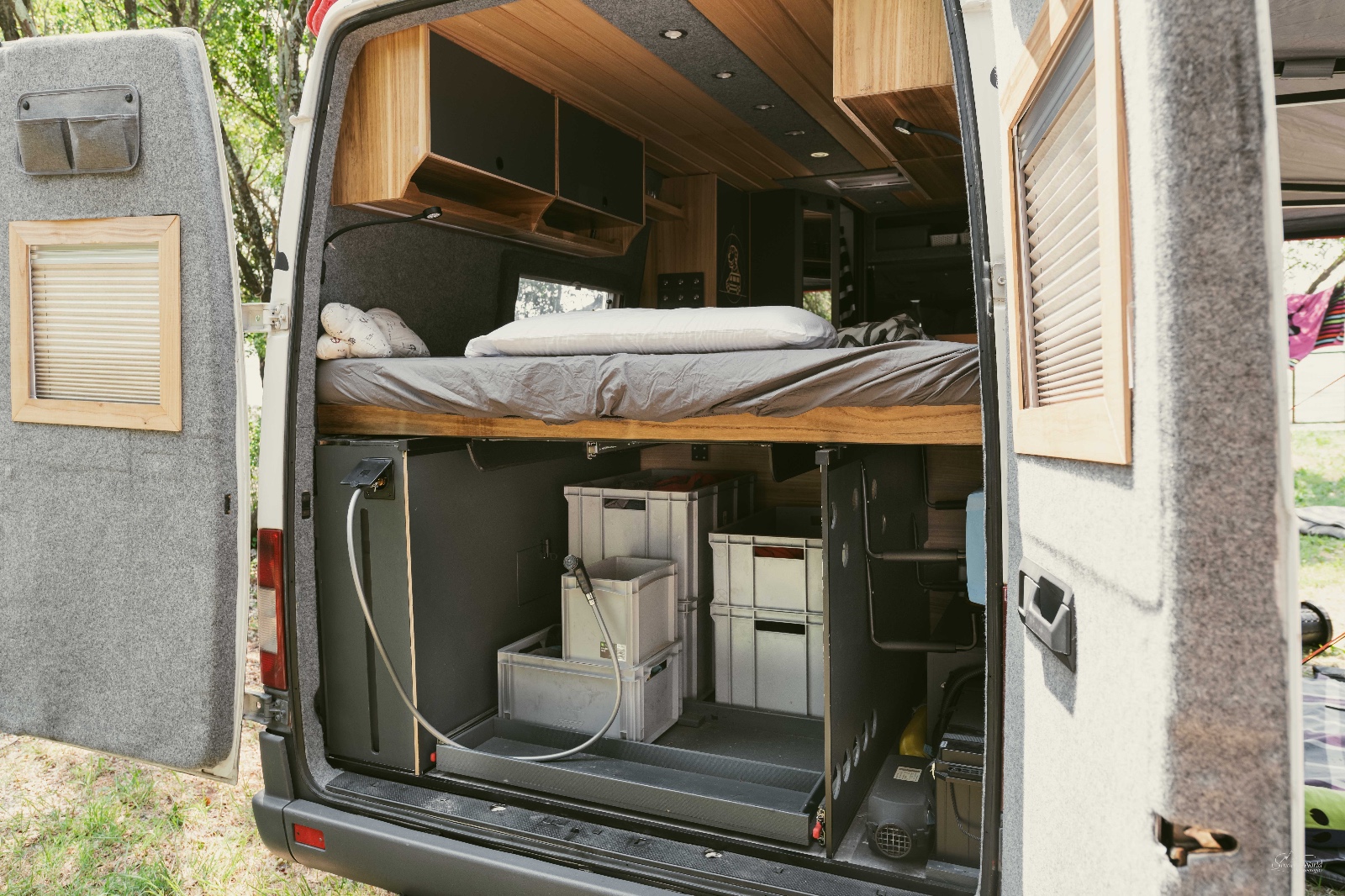 Die Basis des „Fleckensprinter“ ist ein Mercedes Sprinter 903, 313 CDI. Der Ausbau verbindet Autarkie, Stauraum und Komfort: Küche, Dusche, flexibles WC und ausziehbares Bett. Leichtbau spart Gewicht, die Hundebox ist in die Dusche integriert – ideal für lange Reisen, Naturerlebnisse und unabhängiges Unterwegssein.