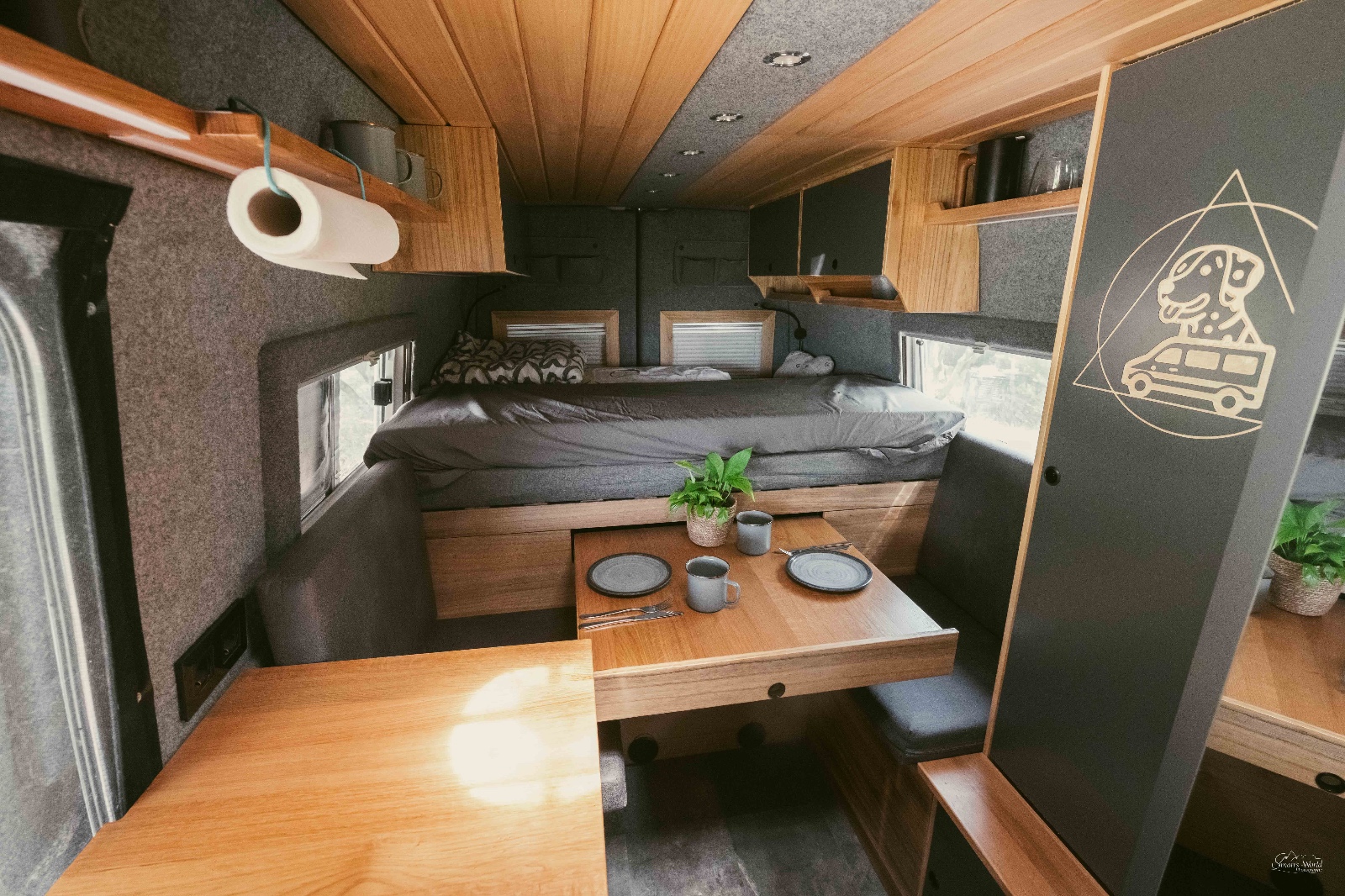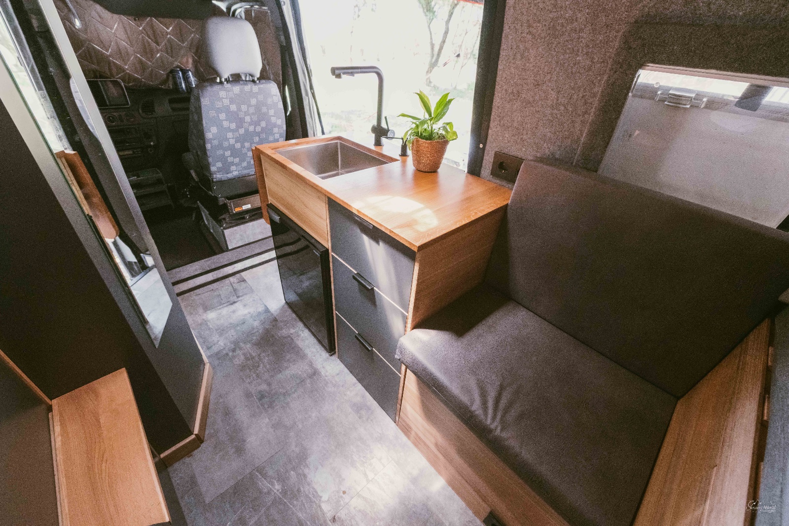 Der Fiat Ducato L5H3 wurde in nur 9 Monaten von Tommy und Luisa zum rollenden Appartement umgebaut. Mit praktischen Details wie einer elektrischen Schubladenverriegelung verbindet ihr Zuhause Funktionalität mit einem stimmigen Design in warmen Tönen. So entsteht ein gemütlicher Rückzugsort zum Entspannen und Arbeiten.